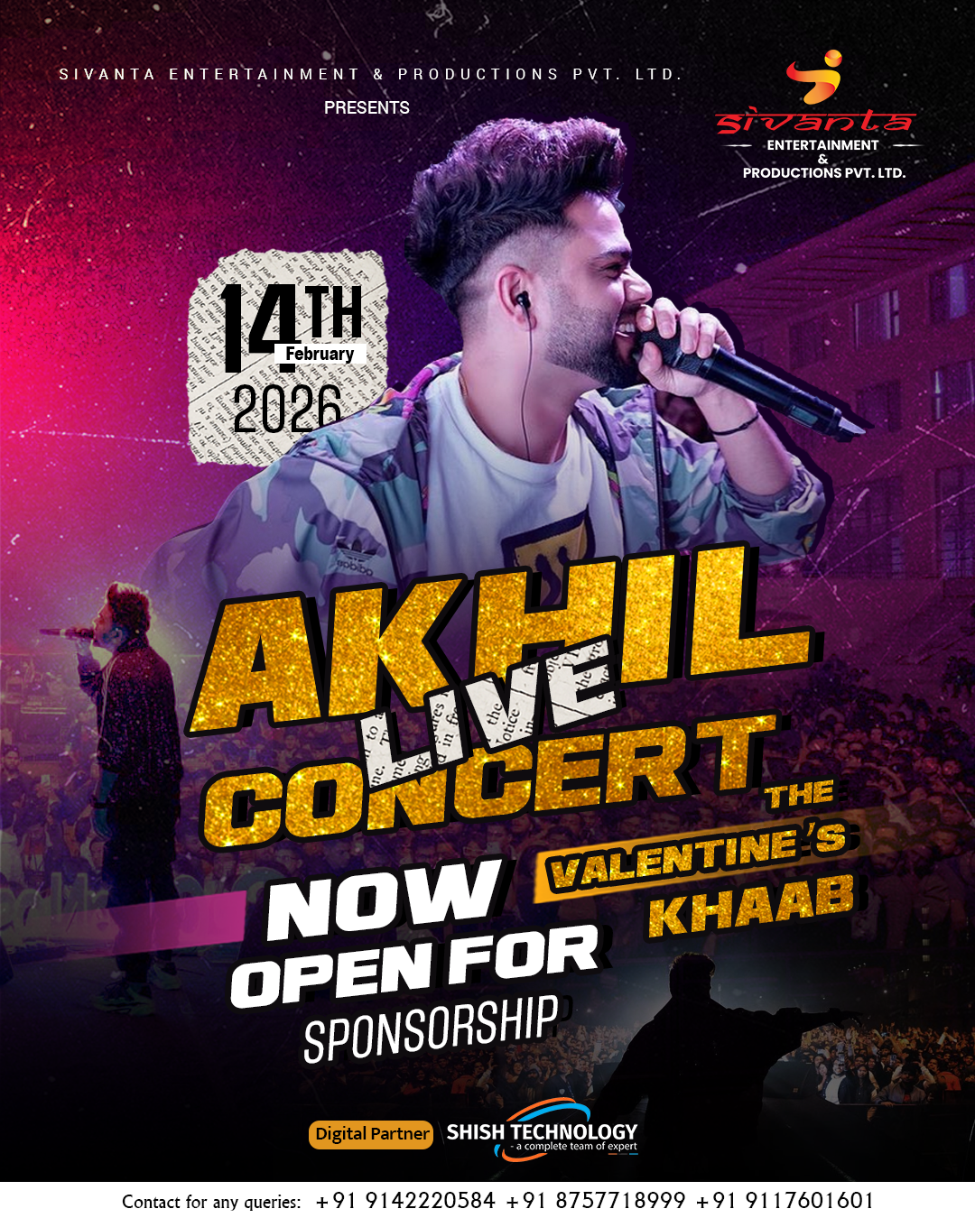 Event Overview This Valentine’s Day, 14th February 2026, Sivanta Entertainment & Productions Pvt. Ltd. presents Akhil Live Concert—a celebration of love, music, and togetherness. Known for his soulful romantic hits, Akhil brings an unforgettable musical experience curated for couples, youth, and music lovers.